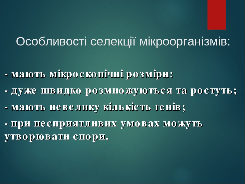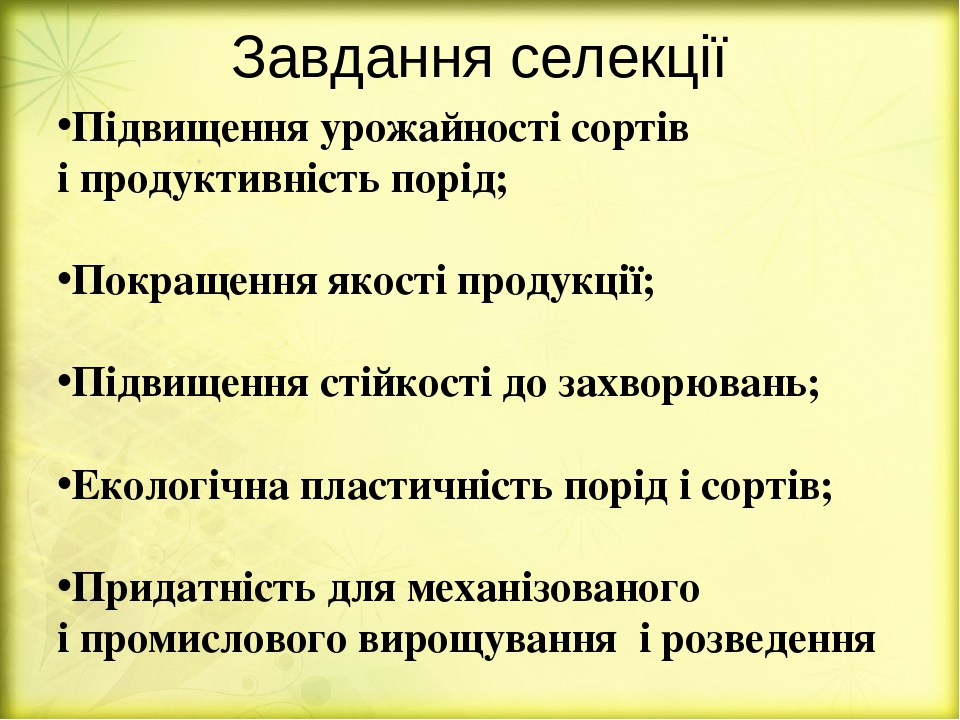 Читаємо п.55, роздивляємось слайди, виписуємо на стор.59 ( 5 завдання, там де тести, особливості селекції рослин, тварин, мікроорганізмів), виконуємо завд 1-6 та відсилаємо на перевірку! Ще одна буде тематична, працюйте!!!( щоб був конспект)